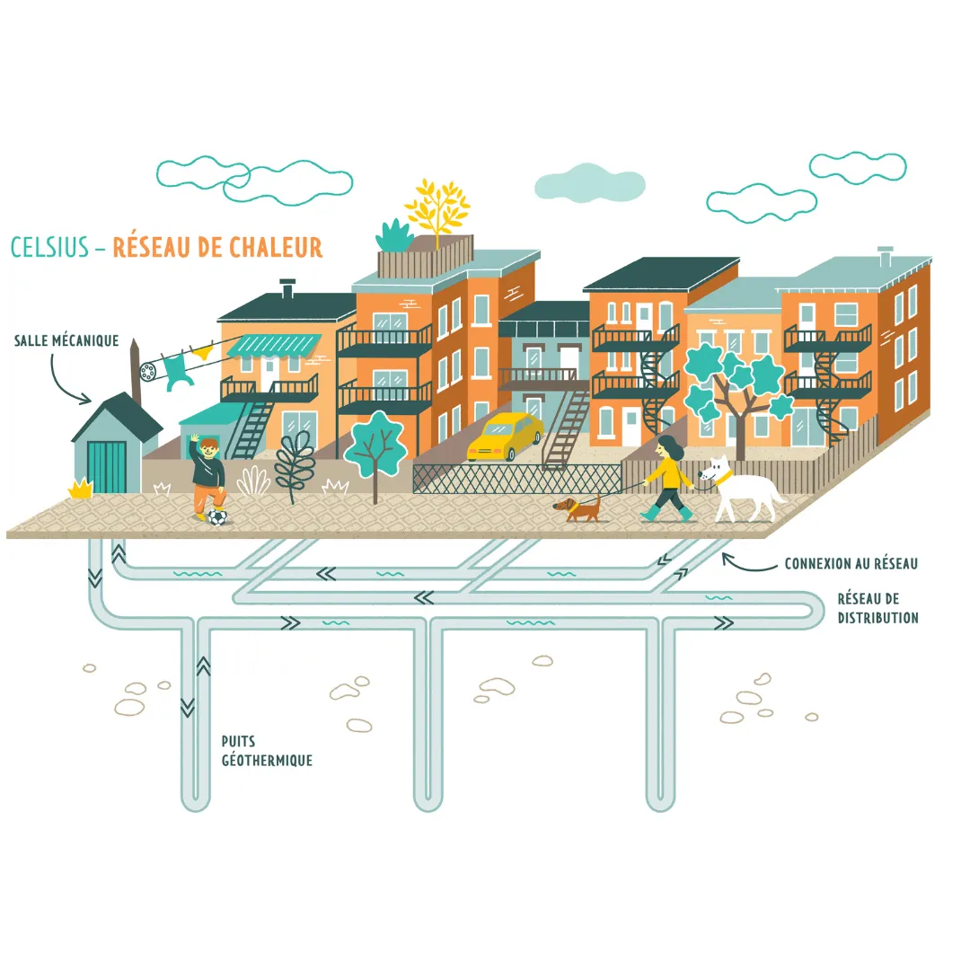 La géothermie collective dans les ruelles permet de chauffer en hiver et de climatiser en été les logements connectés au réseau. En se regroupant, cette technologie peut être déployée afin de réduire les émissions de gaz à effet de serre liées au chauffage et à la climatisation, une façon audacieuse d’agir dans nos milieux bâtis pour faire face, ensemble, à l’urgence climatique.